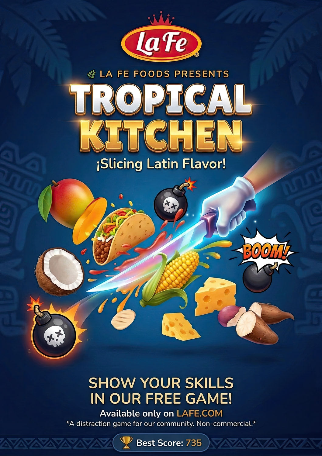 "Slice the Latin flavor! Jump into Tropical Kitchen, a fun and free game by La Fe Foods. Swipe to chop delicious ingredients like mangos, corn, and yuca, avoid the bombs, and aim for the top score. Take a quick break and let the slicing begin!"